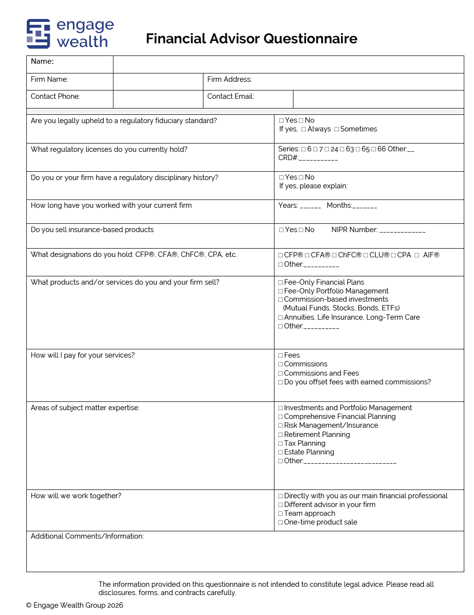 We would welcome you to enter your details below to receive periodic information and updates from Engage Wealth Group.
